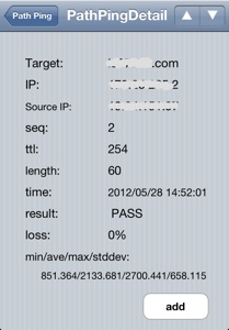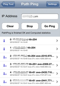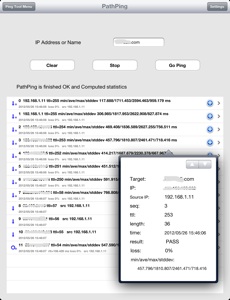 IPアドレスもしくは名前を入力し、GoPingボタンをタップする事により、その宛先までの経路を表示します